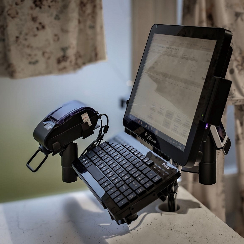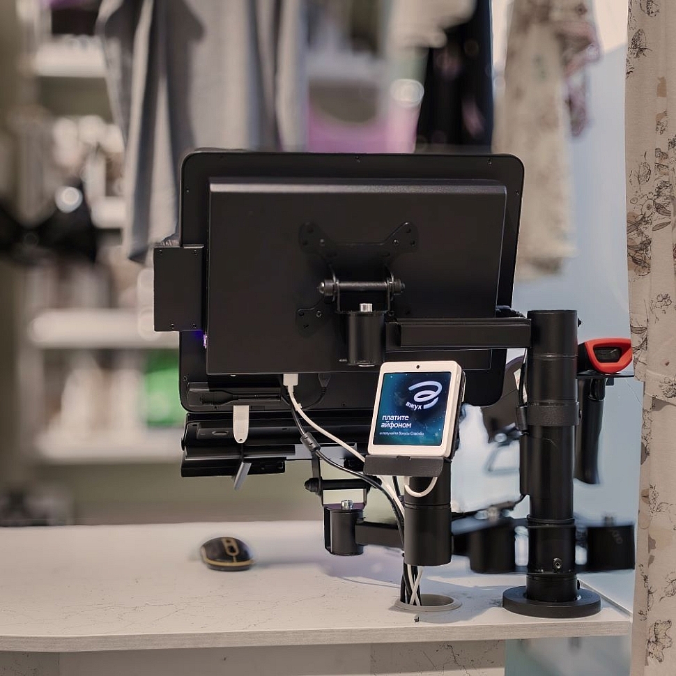 Компьютерный моноблок и фискальный регистратор: вместо того чтобы занимать почти половину стола, моноблок был поднят в воздух. Стойка 300 мм, установленная у заднего края столешницы, и кронштейн для монитора с плечом надежно зафиксировали экран на уровне глаз кассира. За счет кронштейна в 200 мм монитор сдвинулся в сторону от стойки, освободив место для сканера и фискального регистратора. А пространство под моноблоком использовали для кронштейна под клавиатуру. ФР Атол-30 закрепили на стойку над столешницей с помощью кронштейна для принтера с плечом 300 мм.